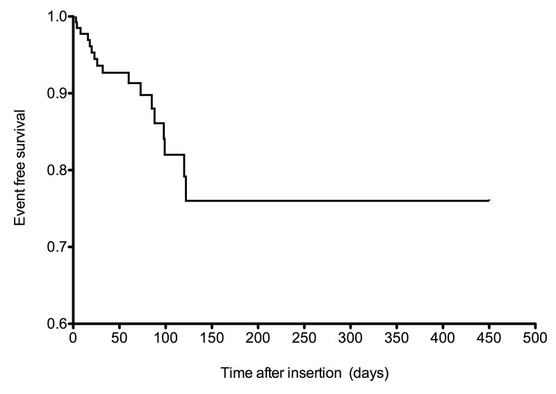 Figure 2 Kaplan-Meier curve of catheter survival based on the occurrence of complications that led to catheter removal.