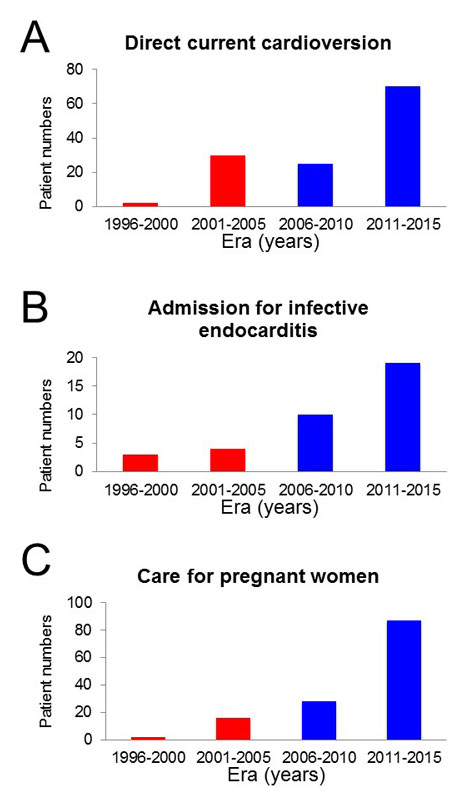 Figure 4 Number of direct current cardioversions (panel A), number of admissions for infective endocarditis (panel B) and number of women followed during pregnancy (panel C).