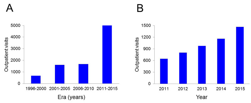 Figure 3 Number of outpatient visits during the study period. Panel A: Number of outpatient visits per 5-year intervals. Panel B: Number of outpatient visits per year over the last 5 years of the study period.