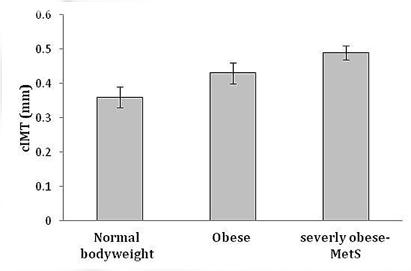 Figure 1 Mean and SEM of carotid intima-media thickness (cIMT) levels in the groups with normal bodyweight, obese without metabolic syndrome (MetS) and severely obese with MetS.