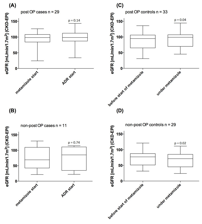 Figure 3 Estimated glomerular filtration rate (eGFR) at the start of metamizole therapy and at ADR start (case groups, left side), eGFR before the start of metamizole therapy and under metamizole therapy (control groups, right side), compared with use of the Wilcoxon signed-rank test.