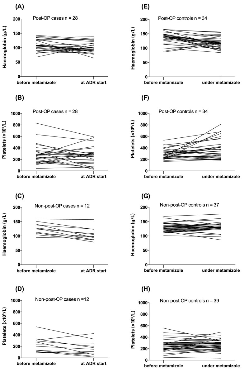 Figure 2 Haemoglobin and platelet counts before starting metamizole and at time of diagnosis of ADR (case group A–D) or at last follow-up while taking metamizole (control group E–H).