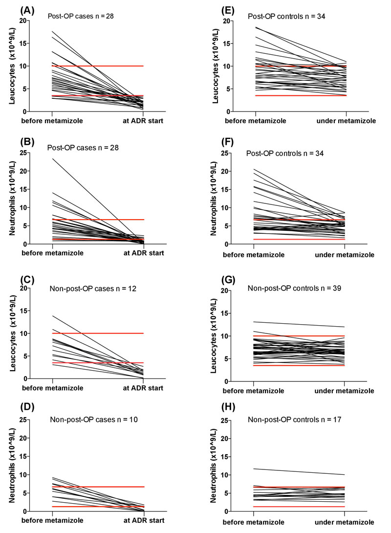 Figure 1 Leucocyte and neutrophil counts before starting metamizole and at time of diagnosis of ADR (case groups A–D) or at last follow-up while taking metamizole (control groups E–H). Red lines indicate upper and lower reference values (10–3.5 × 109/l for leucocytes and 6.7–1.3 × 109/l for neutrophils).