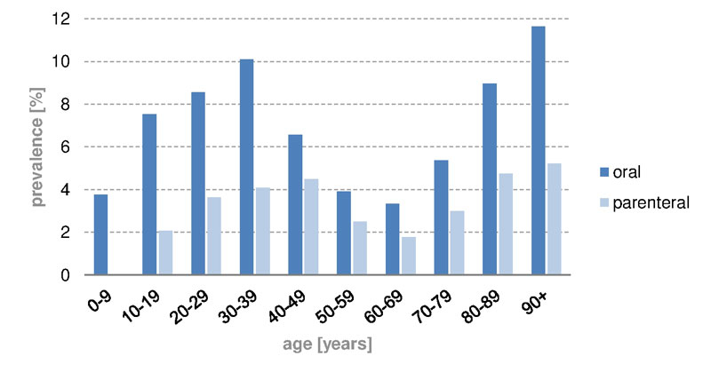 Figure 3 Prevalence of oral and parenteral iron substitution in different age groups in Switzerland, 2012 to 2014.