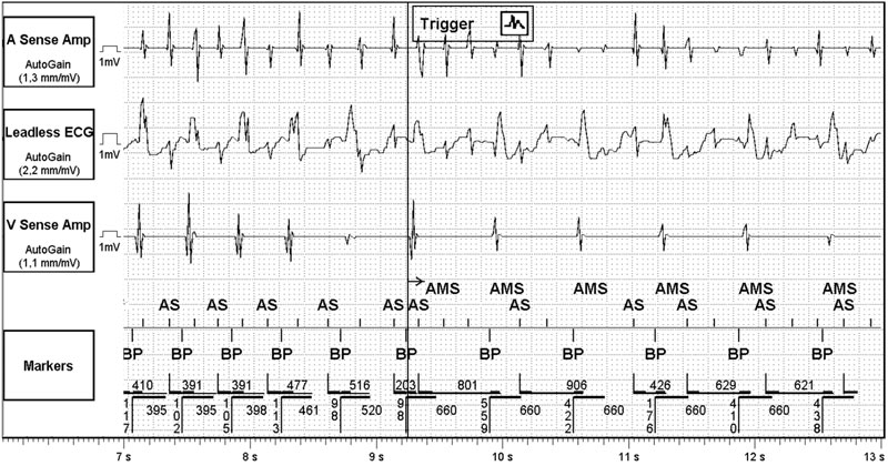 Figure 2 Example of an electrogram of an atrial high rate episode recorded by a biventricular pacemaker. The channel “A Sense Amp” corresponds to the atrial electrogram. This electrogram shows an irregular atrial high rate episode at a rate of about 300 beats per minute, corresponding to atrial fibrillation.