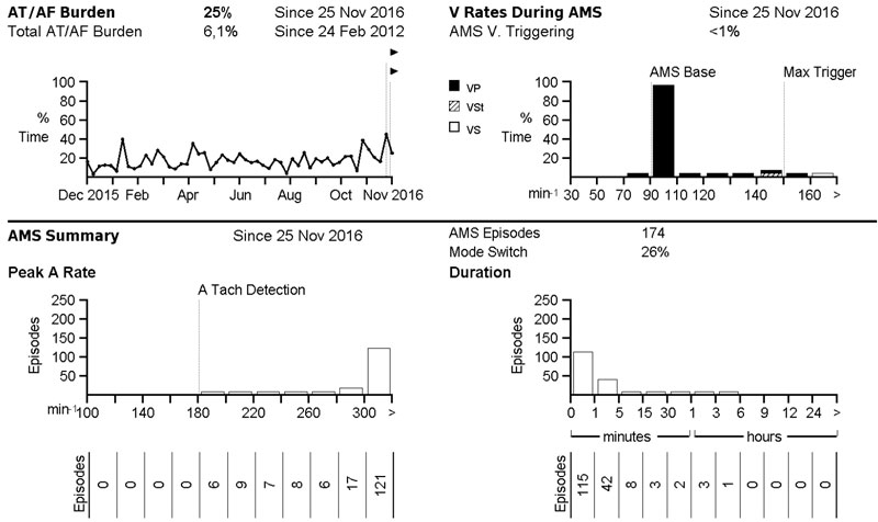 The number of patients with cardiac implantable electronic devices including an atrial lead is steadily growing. These devices permit continuous monitoring for atrial high-rate episodes exceeding a programmable or device-specific duration. If this function is enabled, a notification will appear upon device interrogation if an episode fulfilling programmed criteria occurred (fig. 1). Such notifications may also be transmitted daily by remote monitoring if this feature is enabled, allowing for continuous, almost real-time arrhythmia screening. Several studies have reported an association of atrial high-rate episodes with clinically diagnosed atrial fibrillation, as well as increased risk of ischaemic stroke and even mortality [29–31]. Interestingly, atrial high-rate episodes have also been reported to be an independent predictor for silent brain lesions [32].