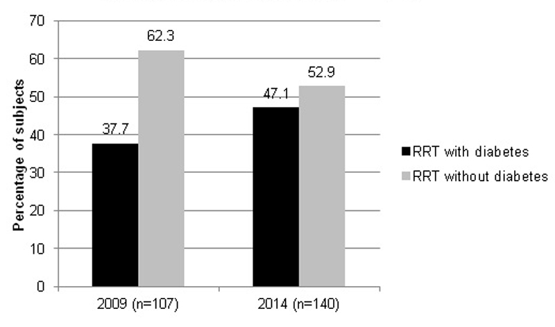 The main limitation of the study is the retrospective analysis of patients with diabetes starting RRT but not listed in 2009 and 2014. We believe that some patients may have been missed, although the error is presumably weak. The diagnosis of diabetes may have been missed in patients presenting with burnt out diabetes and no longer on antidiabetic medication. Accurate prevalence of diabetic retinopathy is lacking in our study owing to incomplete reporting of ophthalmological examinations. Reported comorbidities were based only on the listing of diagnosis, which may have been incomplete.