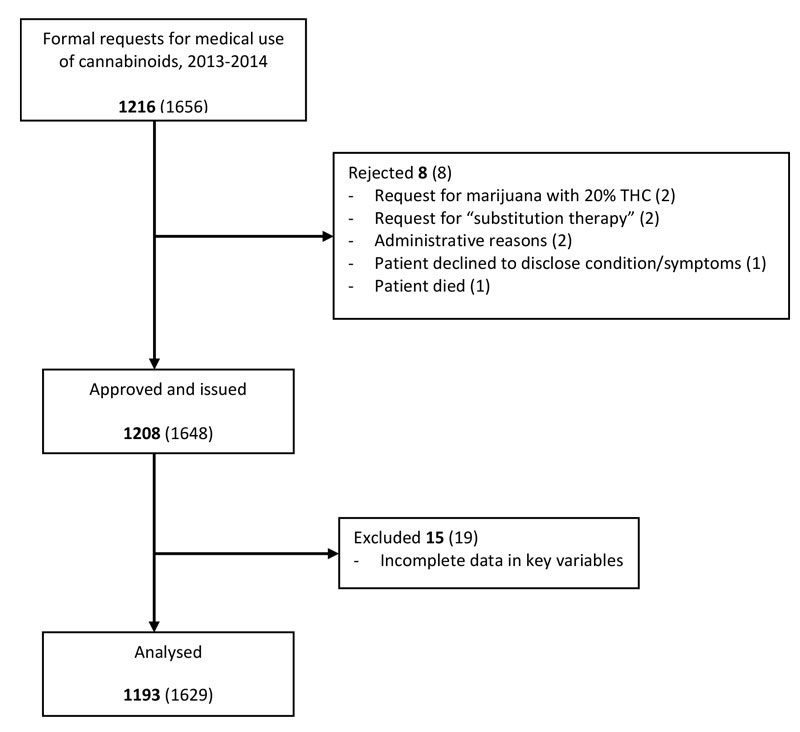 Figure 1 Flowchart of formal requests for medical use of cannabinoids 2013–2014 to the Federal Office of Public Health and exceptional licences granted and included in the study. The figure shows the numbers of unique patients and (in brackets) the numbers of exceptional licences.