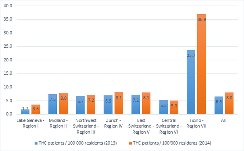 We used descriptive statistics (numbers and percentages) to present results of the requests and the characteristics of patients granted exceptional licences for therapeutic use of cannabinoids. Patient characteristics were taken from the first application for the same patient received in the years 2013 and 2014. We examined patient characteristics by the main symptoms pain and spasticity, and present detailed information on the underlying diagnoses reported for patients granted exceptional licenses for therapeutic use of cannabinoids. Finally, we calculated the rate of patients granted access per 100 000 residents by NUTS II region using the population statistics available from the European Union (Eurostat) [26]. We used Stata software version 14.1 (Stata Corporation, College Station, Texas, USA) for all analyses. Ethical approval was granted by the Ethics Committee of the Canton of Bern (KEK-Nr. 296/15).