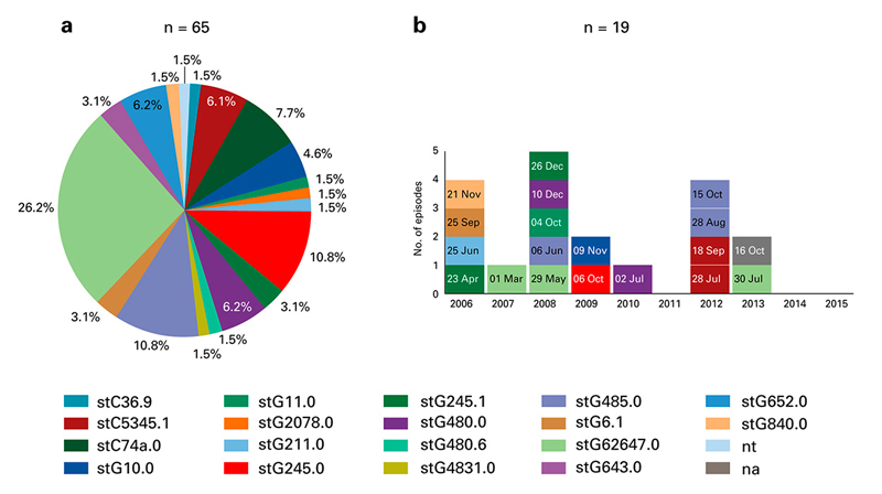 Figure 1 (a) Pie-chart with proportional distribution of 65 emm types of Streptococcus dysagalactiae isolates causing bacteraemia in adults over a 10-year period. Each colour represents one emm type. Two isolates were not available for emm type determination (na). One isolate was not typable (nt). (b) Distribution of emm types of S. dysgalactiae isolates causing 19 episodes of bacteraemia in 16 patients with intravenous drug use. Each square represents an episode, each colour a specific emm type. One isolate was not available for emm type analysis (na, grey colour). The date of bacteraemia is indicated within each square. In three female patients two episodes of bacteraemia with 67 days interval (4 Oct and 10 Dec 2008), 210 days interval (29 May and 26 Dec 2008), and 269 days interval (6 Oct 2009 and 02 Jul 2010), respectively, occurred. In 2012, four episodes in four patients (three women, one man) with two emm types was noted.