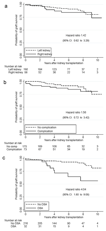 Figure 2 Death-censored graft survival according to side of kidney (a), occurrence of surgical complications (b) and presence of donor-specific antibodies (DSA) (c).
