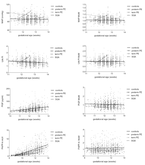 PlGF increased significantly between 10 and 14 weeks of gestation in uneventful pregnancies (p <0.0001, r = 0.31), as well as in pregnancies resulting in SGA (p = 0.015, r = 0.35) but not with PE. PlGF-MoMs did not correlate with gestational age in complicated and uncomplicated pregnancies.