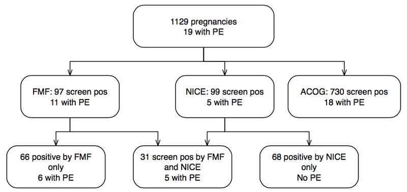 Both of the two patients (100%) with eoPE, as well as 4/5 (80%) patients who developed pPE were screen positive for eoPE, as well as pPE and tPE; 7 of 14 (50%) patients with tPE were screen positive for tPE, resulting overall in 11/19 (57.9%) PE pregnancies that were screen positive.
