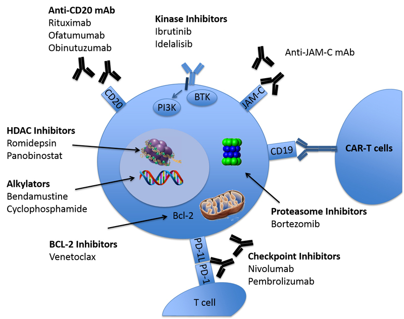 Figure 1 Mechanisms involved in targeting B-cell lymphoma cells. Traditionally, alkylators and anti-CD20 antibodies have been used for B-cell lymphoma treatment. Newly developed drugs target intracellular kinases such as BTK or PI3K, proteasomes, BCL-2 molecules, or HDAC. More recently, modified T-cells (CAR, chimeric antigen receptor), and checkpoint inhibiting monoclonal antibodies have been applied. An alternative approach in the preclinical phase consists of targeting molecules regulating B-cell migration, such as junctional adhesion molecule C (JAM-C).