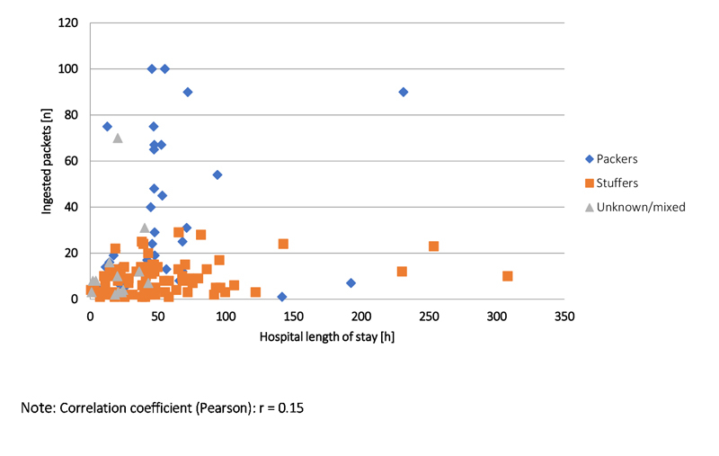 The mean length of stay in the emergency department was 51.2 hours. Location of the drug packages had no effect on the mean length of stay (MOS); MOS was 61.9 hours and 43.8 hours for locations in the stomach and lower intestine, respectively (p = 0.13). Nevertheless, the MOS was consequently prolonged for the three patients requiring surgical intervention (mean 158.1 hours, p <0.01). The MOS was not correlated with hypertension (mean 53.7 hours) or tachycardia (46.9 hours) on admission. The MOS was also independent of the number of ingested drug packages (fig. 2).