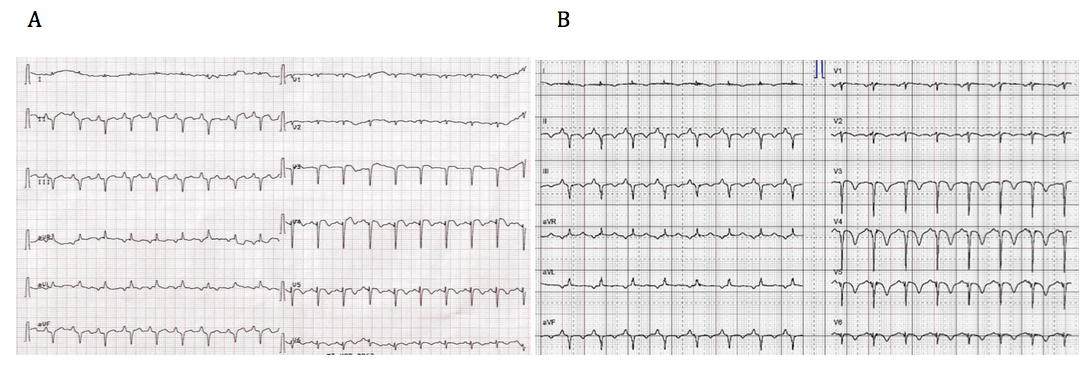 Figure 1 (A) ECG showing diffuse ST segment elevations. (B) Follow-up ECG after 10 hours demonstrates diffuse T wave inversions, particularly prominent in V3–V5.