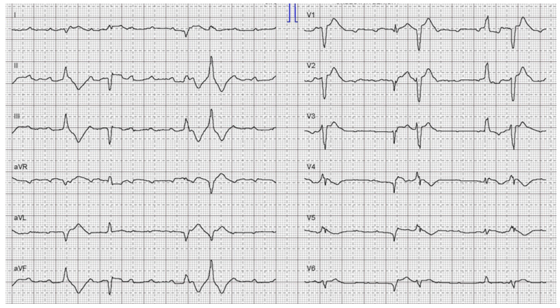 A 65-year-old man was admitted to a stroke unit after a cerebrovascular accident. A few days after hospital admission, the patient developed dyspnoea and episodes of complete heart block (fig. 2) necessitating cardiopulmonary resuscitation. After successful return of spontaneous circulation, continuous intravenous epinephrine was started. TTE showed severely reduced left ventricular systolic function (LVEF 25%), with typical apical ballooning. Furthermore, coronary angiography confirmed normal coronary arteries. During monitoring in the intensive care unit, the clinical course was complicated by ventricular tachycardia. Therefore, therapy with epinephrine was discontinued and replaced by levosimendan. No further tachyarrhythmias were observed.