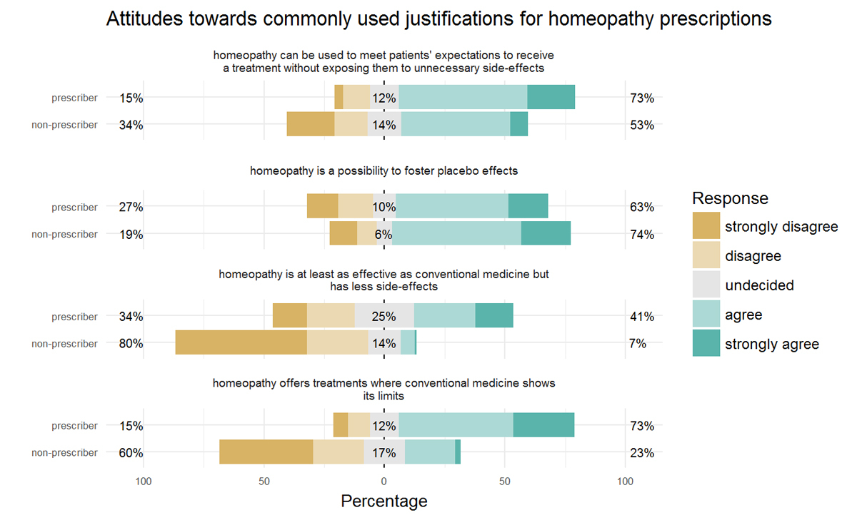 Figure 3 Attitudes towards commonly used justifications for prescriptions of homeopathy; bars represent prescribers’ and non-prescribers’ responses to 5-point Likert scale items; colours represent the proportions of individual response categories. The horizontal position of the bars represents the summarised tendency of the responses (left = % disagree, centre = % undecided, right = % agree).