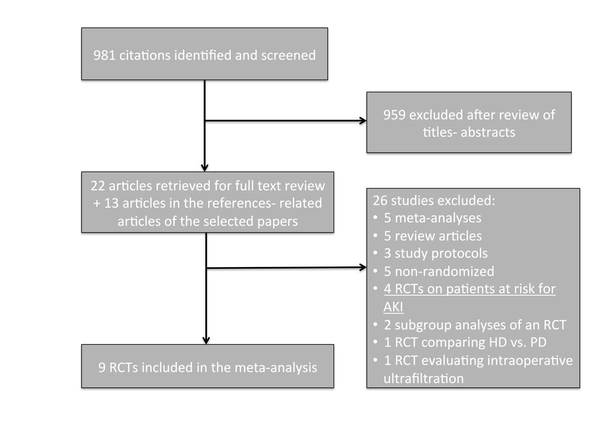 A Medline literature research was conducted in PubMed from January 1960 to July 2016, inclusive. The reference lists of all selected studies and available meta-analyses were also reviewed. The following Mesh terms were used: Renal Dialysis or Peritoneal Dialysis or Kidneys, Artificial or Acute Kidney Injury/therapy and Acute Kidney Injury. The search was limited to Clinical Trials or Randomized Clinical Trials or Meta-Analyses, and concerned articles in the English or French language. The search was repeated for the same terms as free text rather than Mesh terms in the Title or the Abstract, using the same limits. An alternative strategy, using clinical trial-specific Mesh terms or text words, was also used (appendix 1).