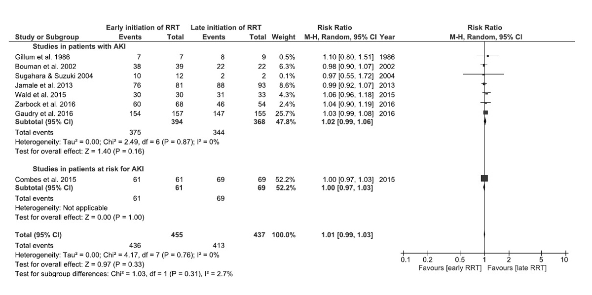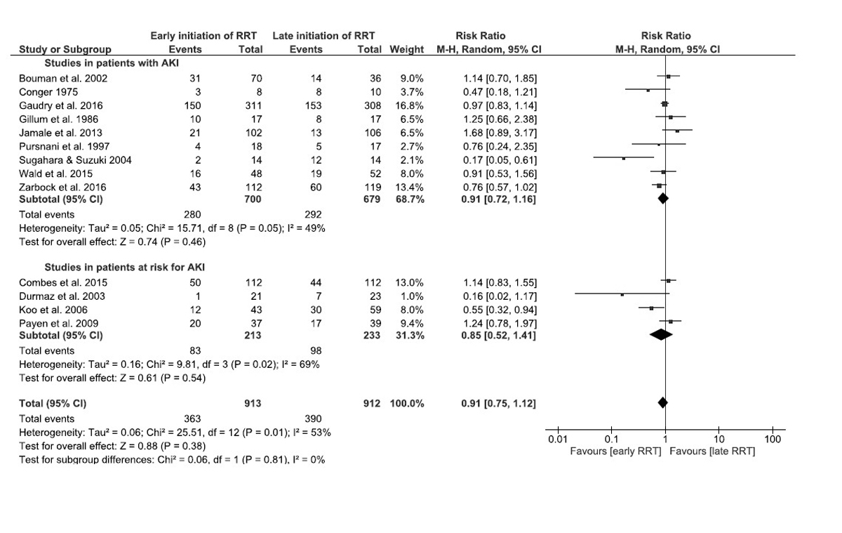Four randomised controlled trials (RCTs) attempting to address this question have been published over the last 4 years [5–8]. Systematic review and meta-analysis of the larger pool of randomised data now available is needed to provide clarity on the potential benefits and risks of early compared with delayed initiation of RRT in AKI and to provide the information needed to most efficiently plan definitive trials. We therefore conducted a systematic review and meta-analysis of randomised trials to better estimate the effects of early initiation of RRT among patients with AKI compared with late initiation of RRT on short-term mortality as well as other relevant outcomes such as recovery from AKI and infectious complications. We also analysed the impact of preventive dialysis on the same outcomes.