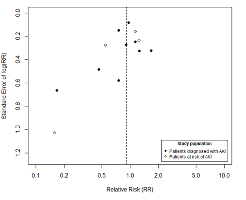 A funnel plot for all 13 studies (9 in patients with AKI and 4 in patients at risk for AKI) is depicted in supplementary figure S1 (appendix 2). No major asymmetry was identified.