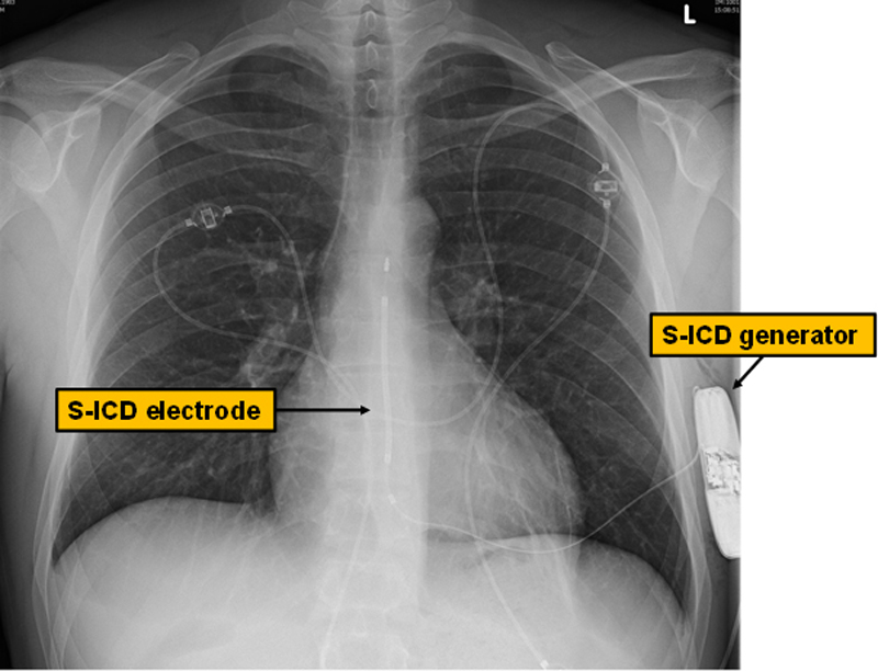 Figure 1 Chest X-ray of a male patient after S-ICD implantation. The generator of the S-ICD is shown on the left side of the patient together with the electrode, which is tunnelled subcutaneously from the generator to the xiphoid area and towards the suprasternal notch.