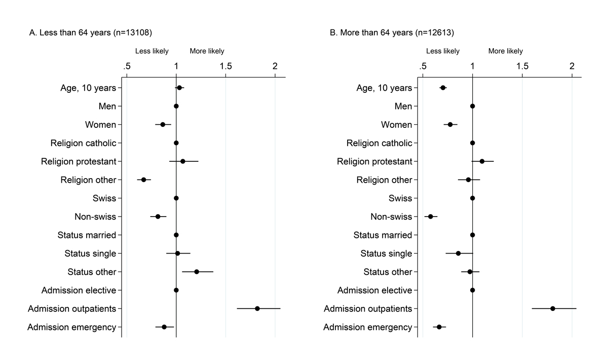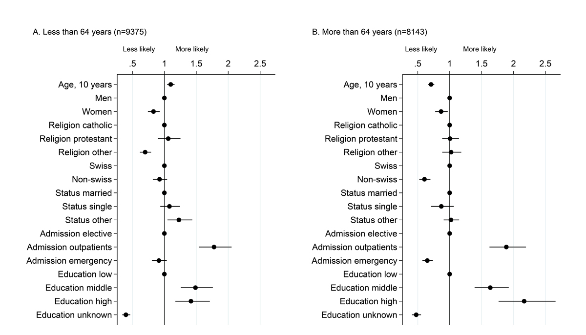 Figure 2 Factors associated with willingness to participate among 25 721 patients. Dots represent odds ratios and bars 95% confidence intervals from a multivariable logistic model including willingness to participate as the dependent variable, run separately in the two age strata. The age cut off at 64 years was chosen as it is close to the median age and happens to closely match the retirement age in Switzerland. Patients aged <64 years are depicted in Panel A, and those aged 64 or older are shown in Panel B.