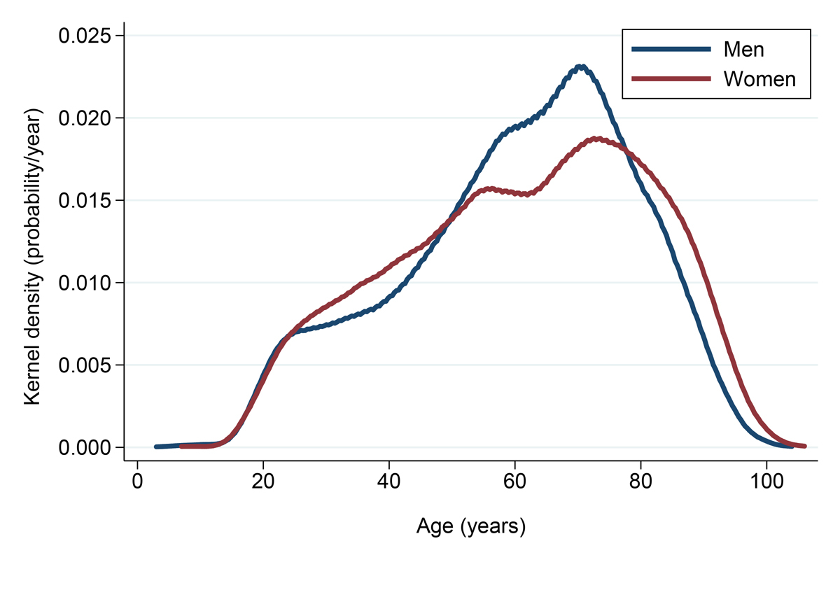 Figure S1 Age distribution of the study population by gender. The distribution of the 25 721 patients (13 912 males and 11 809 females) included in the analysis according to age is depicted as kernel density.