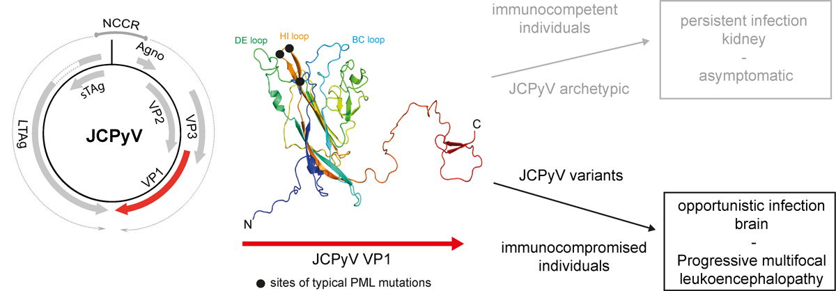 Figure 1 JCPyV and the development of PML. JCPyV encodes for six open reading frames under the control of the regulatory noncoding control region (NCCR) element. Mutations in the three exterior loops of the major capsid protein JCPyV VP1 may in situations of immunocompromise lead to an opportunistic infection in the brain, known as PML.