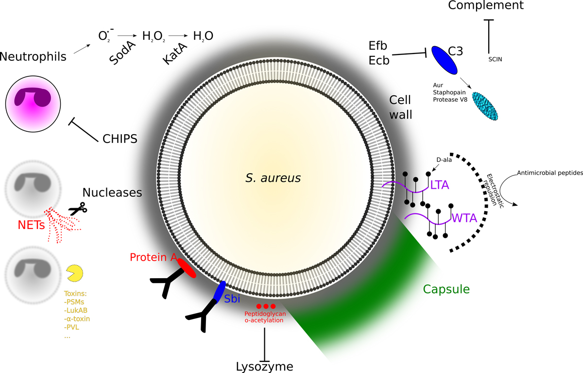 To avoid damage by granulosome contents, S. aureus modifies its peptidoglycan cell wall to make it resistant to lysozyme, insert molecules that inhibit binding of antimicrobial peptides (dlt operon for adding D-alanyl esters to teichoic acids) or degrade said peptides [17]. Trapped in a phagosome, S. aureus tries to escape into the cytoplasm by using phenol soluble modulines (PSMs) and other membrane damaging proteins.