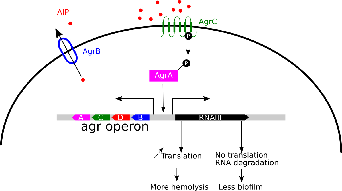 Figure 4 The quorum sensing system. The quorum sensing system agr (for accessory gene regulator) is encoded by an operon. The first open reading frame encodes the transporter AgrB, which is required for secretion and processing of the AgrD, the auto-inducing peptide, AIP. At sufficiently high cell concentration or in constraint environments, the concentration of AIP reaches a threshold and induces the two components system AgrCA, where AgrC activates AgrA. AgrA is a transcriptional activator required for the expression of PSMs and the effector molecule RNA III. RNA III is a paradigm of a regulatory RNA. It binds to the RBS on the mRNA of many genes and inhibits thereby translation. In some instances it binds to upstream sequences, helping to unwind secondary structures that occlude RBS elements and in these cases RNA III acts positively on translation.