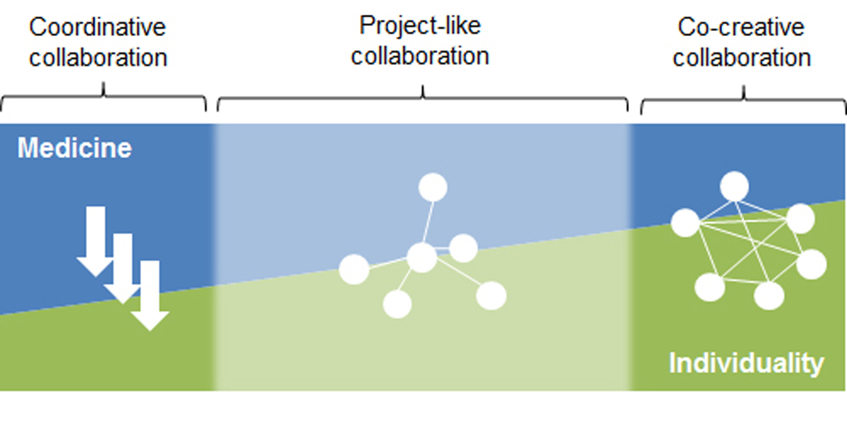 The three forms of collaboration, the medicine/individuality ratio and the corresponding modes of organisation (programme, hub, network) are summarised in a heuristic diagram (fig. 1).