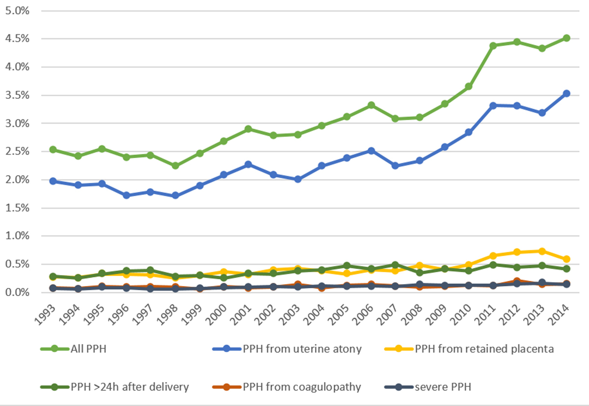 Figure 1 Incidence of postpartum haemorrhage over the 22-year period. Trends in the rate of postpartum haemorrhage (PPH) and haemorrhage by underlying aetiology from 1993 to 2014. The increase in all PPH was paralleled by a rise in uterine atony. Y-axis indicates the incidence (in %) and x-axis shows the corresponding year.