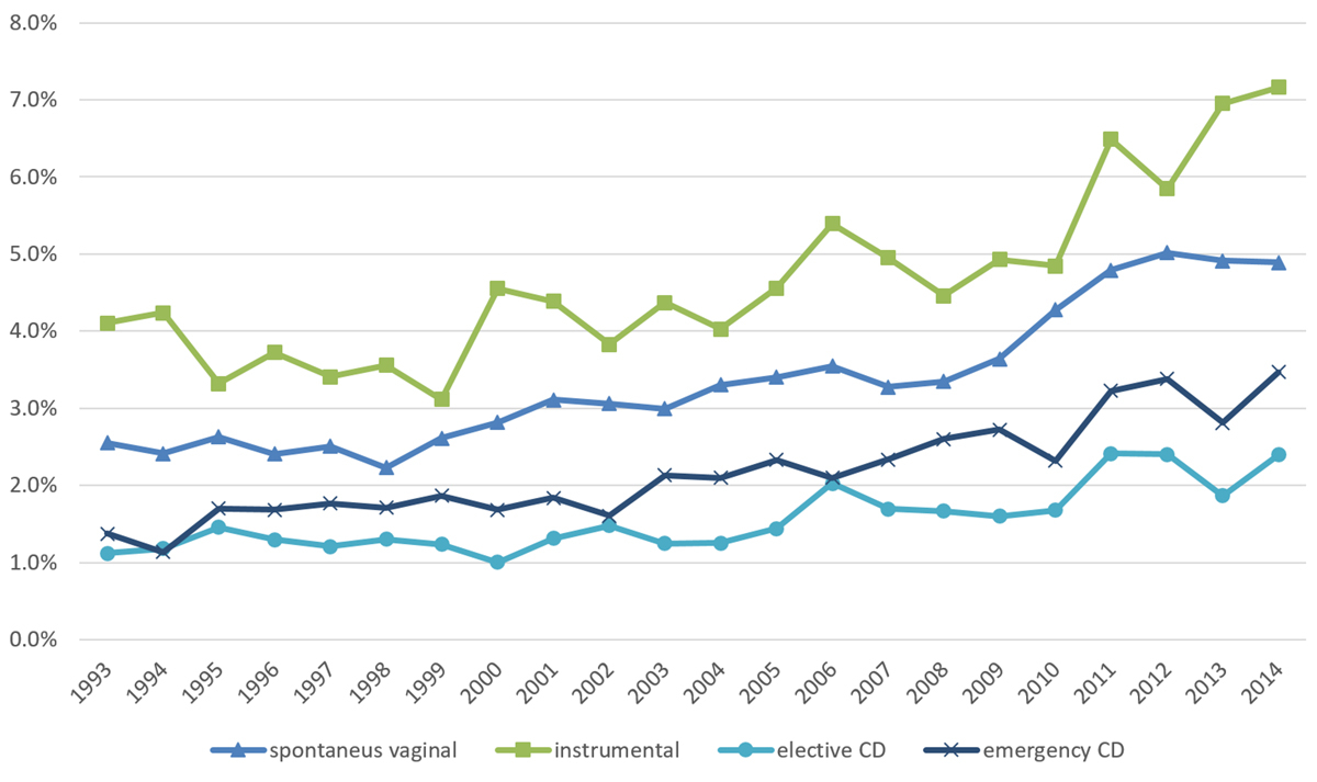 Figure 3 Postpartum haemorrhage (PPH) and delivery mode. Temporal trends in postpartum haemorrhage (PPH) rates in relation to delivery mode from 1993 to 2014. Instrumental (operative) vaginal deliveries showed the highest association with PPH throughout the entire study period. CD = caesarean delivery. Y-axis indicates the incidence (in %) and x-axis shows the corresponding year.
