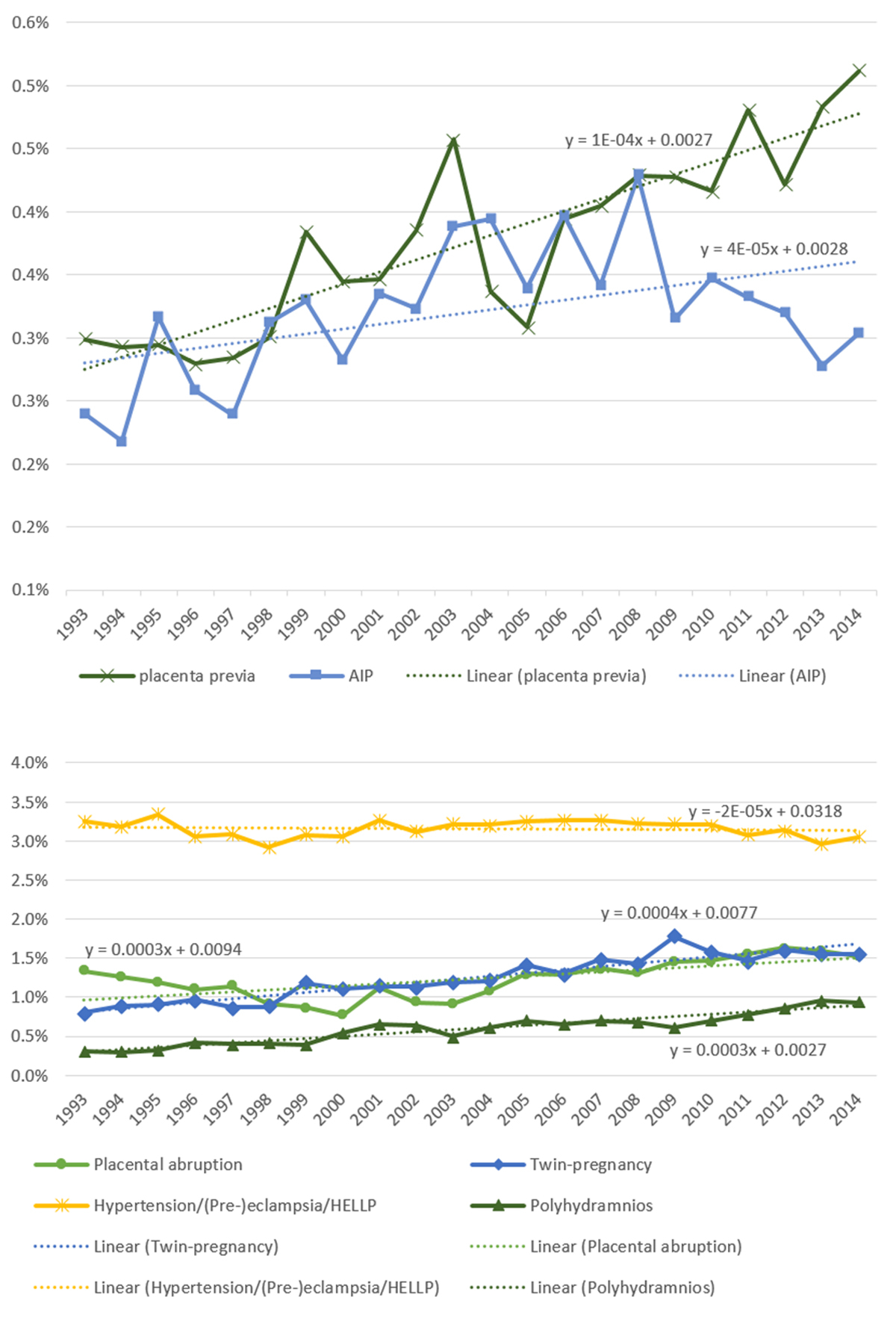 Figure 2 Incidence of significant pregnancy-related risk factors for PPH over a 22-year period. Graphs show temporal trends of significant pregnancy-related risk factors for postpartum haemorrhage (PPH) based on logistic regression analysis. There was an increase in incidence of abnormally invasive placenta (AIP) (above, blue line) and placenta praevia (above, green line), the two risk factors with the highest odds-ratios. Y-axis indicates the incidence (in %) and x-axis shows the corresponding year.