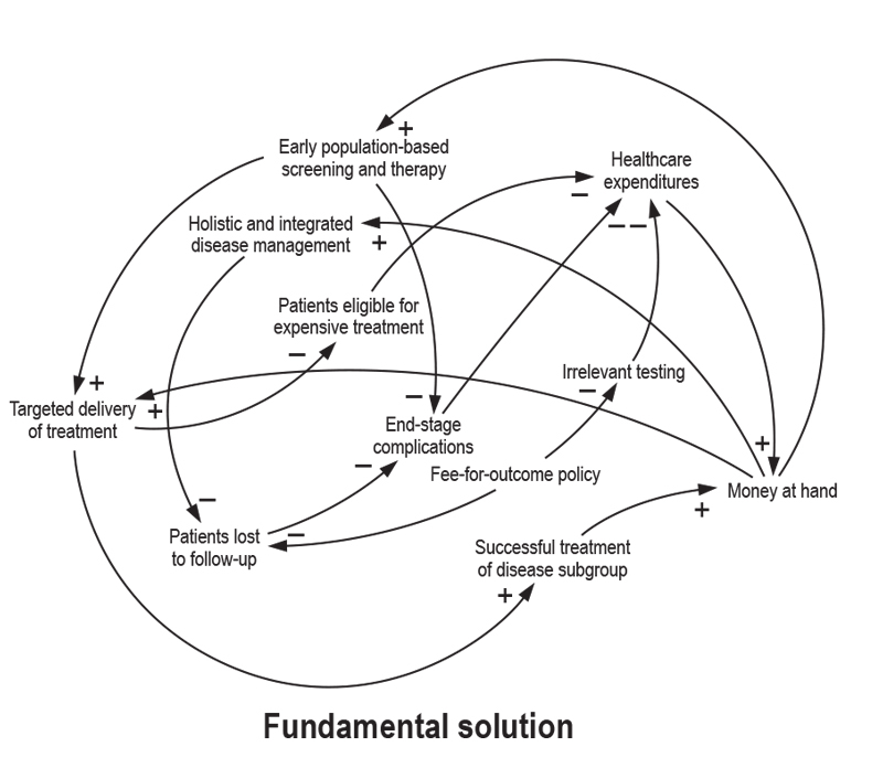 To overcome this problem, we propose four conceptual interventions for clinical practice. These are: (1) fostering prevention, screening, early diagnosis, and therapy; promoting (2) comprehensive and (3) stratified disease management, as well as (4) the targeted delivery of treatment alongside companion diagnostics. Based on our argumentation, we conclude with the political actions that should be taken into consideration to pave the way towards more sustainable healthcare systems.