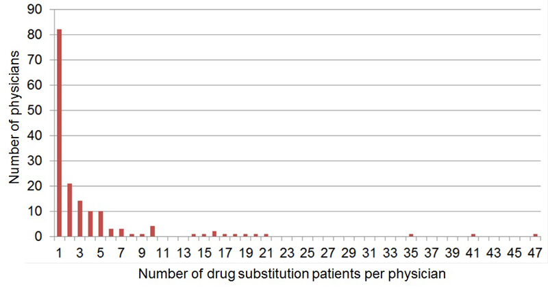 In the drug substitution programme of the canton Aargau 161 physicians were caring for 631 patients (fig. 1). Half of the physicians (82/161) had one and >90% (149/161) ≤10 drug substitution patients. There were nine physicians with 14 to 21 patients and three with 35 to 47 patients.