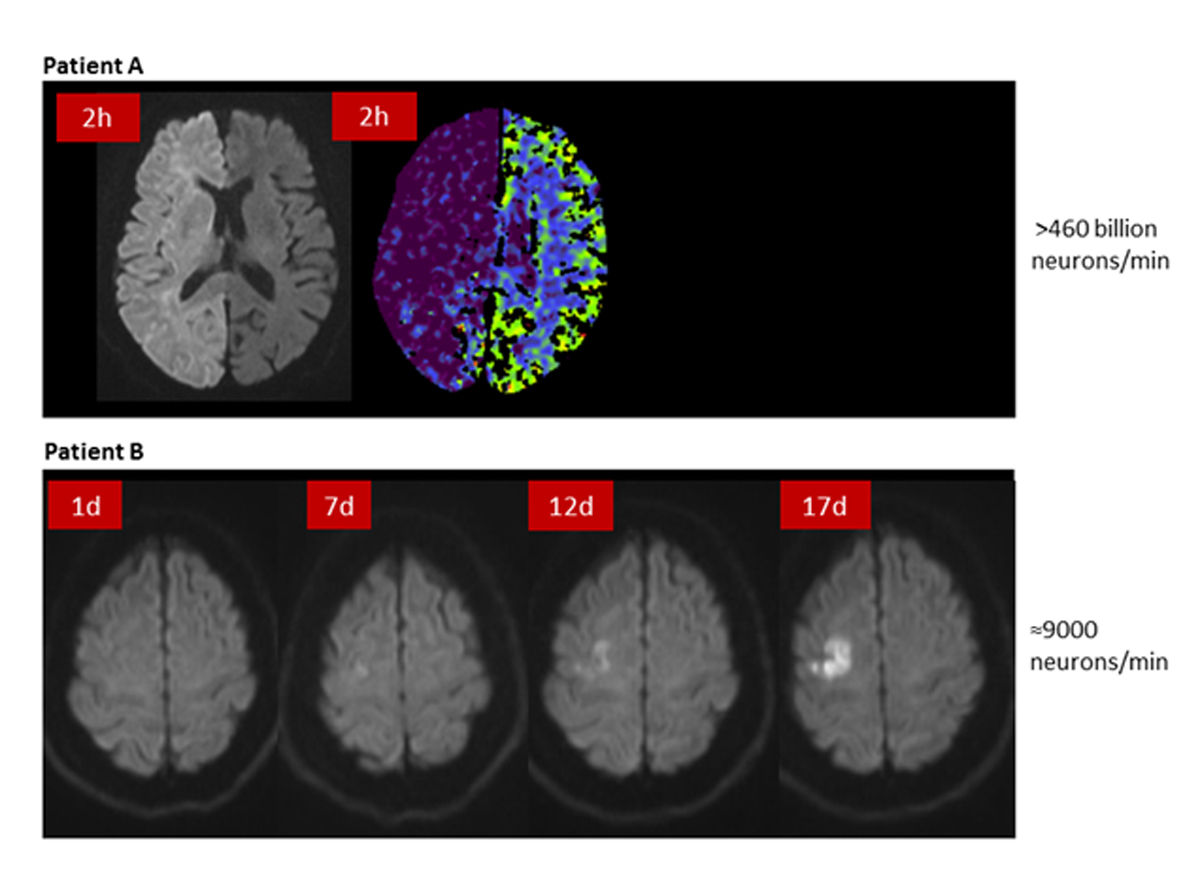 Reperfusion therapy by means of IVT and EVT is highly effective. In large randomised trials only 5–14 patients had to be treated with IVT and 3–7 patients with EVT to prevent one patient from death or dependency [2–10]. The therapeutic effect of these therapies is not only dependent on the success of reperfusion, but is also highly time dependent. Treatment time windows of 4.5 hours for IVT and 7.3 hours for EVT have been defined by pooled analysis of the patients treated in the large trials [43, 44]. Although patients on average may not benefit from later therapy, patient selection based on these time windows would neglect the large interindividual variability of the extent of collateral flow. This regimen would lead to the exclusion from therapy of many patients who would, in fact, benefit. Indeed, infarct growth is much less dependent on the elapsed time than on the quality of collaterals: good collaterals slow down infarct growth and poor collaterals accelerate it [19, 45–48]. Of course reperfusion treatment should always be initiated as early as possible because “time is brain”, but the collaterals set the pace of neuronal loss, and with this the individual time window until infarction of all tissue at risk. Figure 4 illustrates two patients in whom the approximated velocity of neuronal cell loss differed between 9000 neurones/min and more than 460 billion neurones/min. This large variability of the velocity of neuronal cell loss implies that there are probably many patients eligible for therapy far beyond time windows that were calculated on the average of patients. Patient selection based on restricted time windows would not only exclude from therapy eligible patients outside the time windows, but also all patients with wake-up stroke and with unknown symptom onset, who account for at least one third of all stroke patients. Therefore, patient selection for reperfusion therapy should be individualised by imaging salvageable tissue, rather than being restricted by strict time windows.