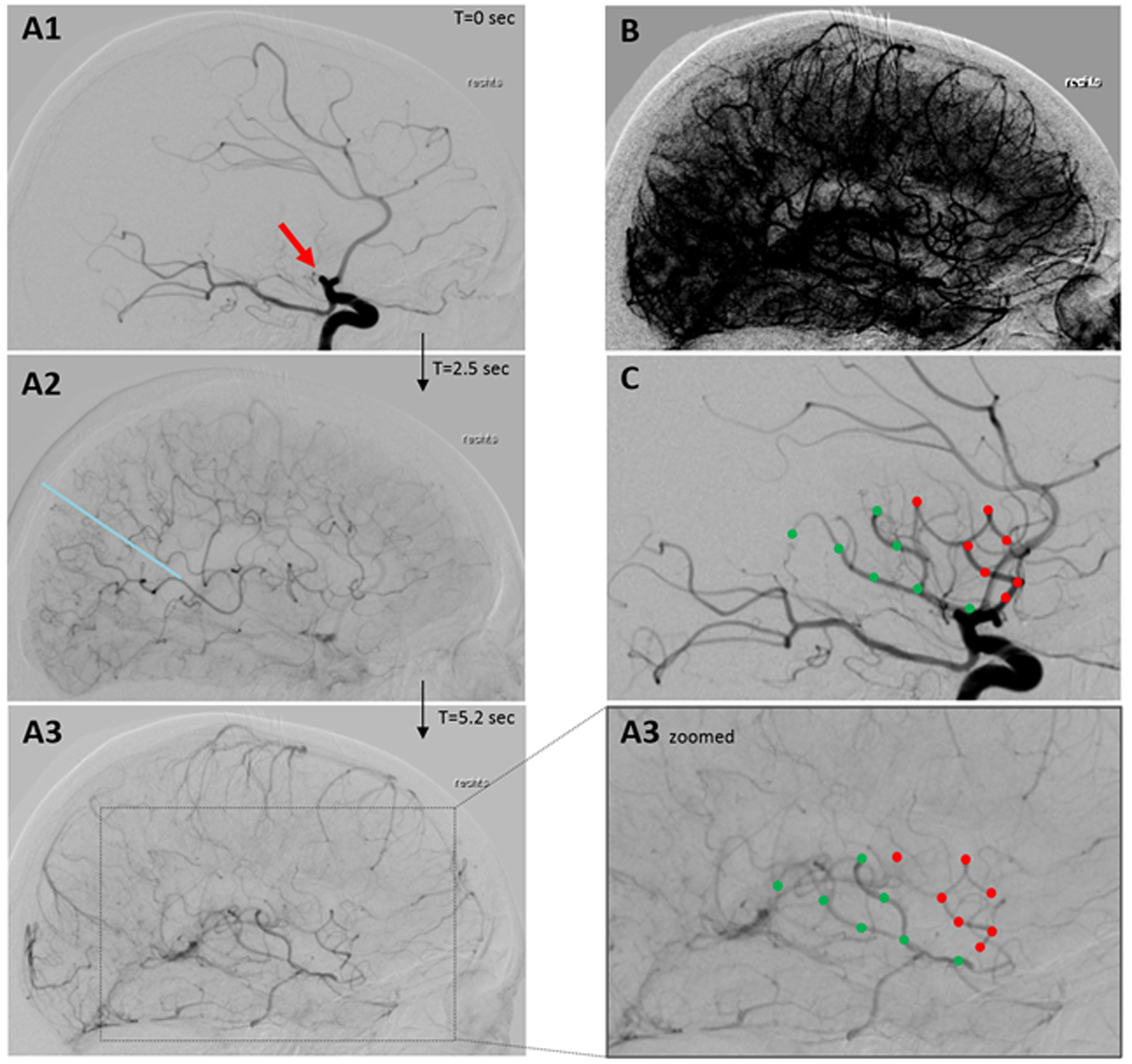 Figure 2 Leptomeningeal collateral flow in occlusion of the proximal middle cerebral artery as seen in conventional angiography (sagittal plane). (A1–A3): serial images after contrast agent application into the internal carotid artery showing proximal middle cerebral artery occlusion (red arrow in A1) with subsequent filling of leptomeningeal collaterals 2.5 sec thereafter fed by the anterior (above and right of blue line in A2) and posterior circulation. After 5.3 sec retrograde collateral flow filled the superior (red dots) and inferior branch (green dots) of the occluded middle cerebral artery (A3 + A3 zoomed). (B) After windowing A3 capillary filling visualised supply of the whole middle cerebral artery territory by collaterals. (C) The same branches filled retrogradely by collaterals in A3 are filled anterogradely after reperfusion of the occlusion. (Pictures: Stroke Centre Bern)