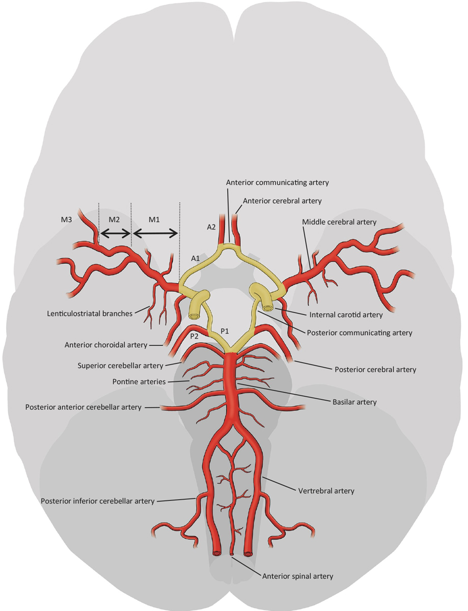 Figure 1 Intracranial vessels. Yellow: Circle of Willis (adapted from the Stroke Guidelines of the University Hospital of Bern 2017, www.strokecenter.ch).