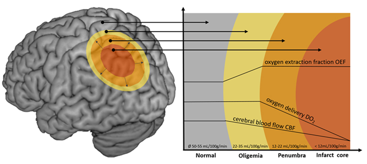 Figure 3 Illustration of the penumbra concept. Infarct core (red): infarcted tissue. Penumbra (orange): salvageable tissue at risk for infarction in case of persistence vessel occlusion. Oligaemia (yellow): hypoperfused tissue without risk for infarction. Cerebral blood flow decreases in direction to the infarct core. Decreased blood flow can be compensated by an increased oxygen extraction fraction and vasodilation of collateral vessels sufficiently enough in the oligaemia but not in the penumbra. (Picture: Stroke Centre Bern)