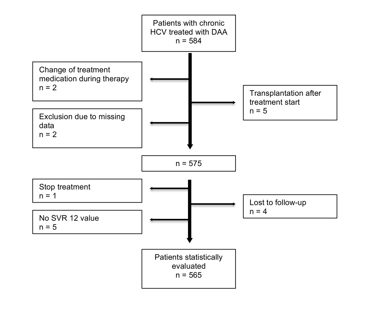 Five hundred and eighty-five patients with CHC undergoing DAA treatment between November 2013 and June 2016 were evaluated. DAA treatment regimens were chosen according to current recommendations of the European Association for the study of the Liver (EASL), Swiss expert opinion statement and/or treatment according to availability, and reimbursement limitations of the Swiss health authorities.