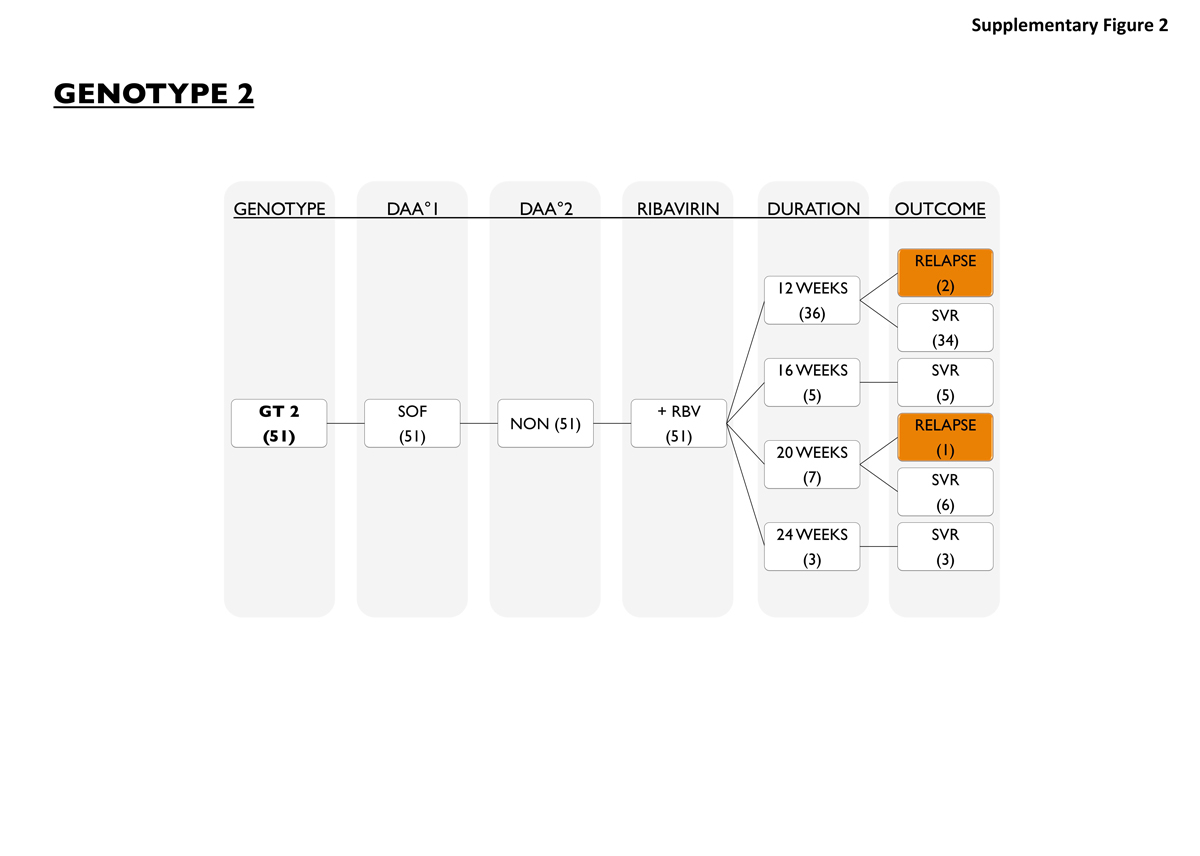 For genotype 2 HCV patients (fig. S2), the only DAA regimen available in Switzerland until 2016 was sofosbuvir/ribavirin for 12, 16, 20 or 24 weeks. Thirty-six were treated for 12 weeks, 5 for 16 weeks, 7 for 20 weeks and 3 for 24 weeks. Three out of 51 patients (6%) did not achieve SVR. One patient was a treatment-naïve cirrhotic and received sofosbuvir/ribavirin for 12 weeks, the other two patients were treatment-experienced. One of them was cirrhotic and was treated for 20 weeks.
