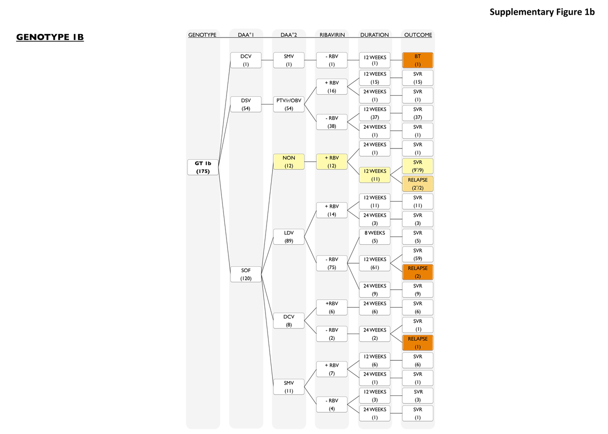 Genotype 1b patients (fig. S1b) were treated with sofosbuvir-containing regimens in 69% (120 of 175). Most of these patients had a combination of sofosbuvir with ledipasvir with or without ribavirin (89 of 120, 74%). Twelve patients had a combination of sofosbuvir plus ribavirin (12 of 120, 10%), 8 patients received sofosbuvir plus daclatasvir with or without ribavirin (8 of 120, 7%) and 11 patients were treated with sofosbuvir plus simeprevir with or without ribavirin (11 of 120, 9%). Fifty-four patients were treated with paritaprevir/ritonavir/ombitasvir and dasabuvir with or without ribavirin in 31% of cases (54 of 175). One patient received a combination of daclatasvir/simeprevir for 12 weeks but did have a viral breakthrough. All other genotype 1b relapses occurred in patients treated with sofosbuvir containing regimens (5 of 120; 4%), while all patients that received paritaprevir/ritonavir/ombitasvir and dasabuvir with or without ribavirin for 12 weeks or 24 weeks reached SVR.