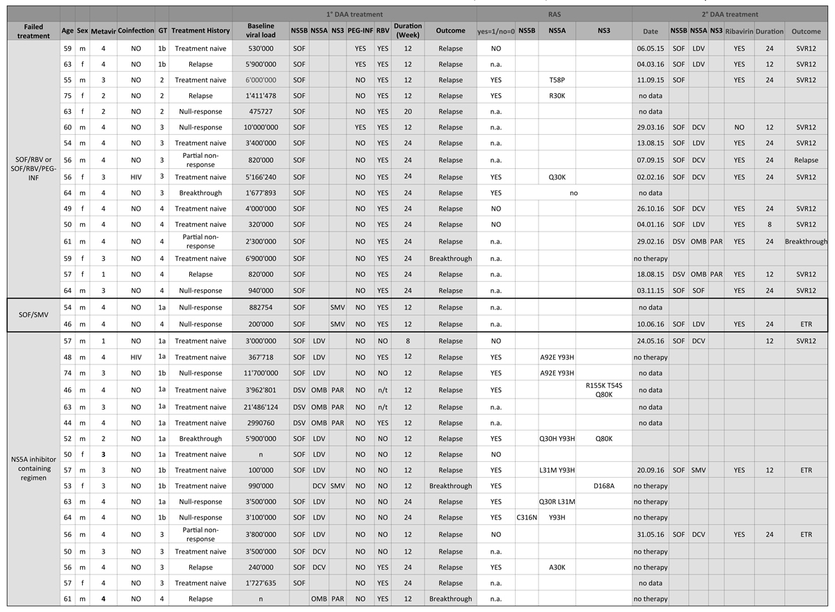 DCV = daclatasvir; DSV = dasabuvir; ETR = end-of-treatment response; GT = genotype; HIV = human immunodeficiency virus; LDV = ledipasvir; n.a. = test results not available or no RAS test was performed; n/t = not taken (patient did not take RBV); PAR = paritaprevir; OMB = ombitasvir; PEG-INF = pegylated interferon; RAS = resistance associated substitutions; RBV = ribavirin; SMV = simeprevir; SOF = sofosbuvir; SVR = sustained virological response; SVR12 = negative HCV-PCR 12 weeks after end of treatment; SVR24 = negative HCV-PCR 12 weeks after end of treatment.