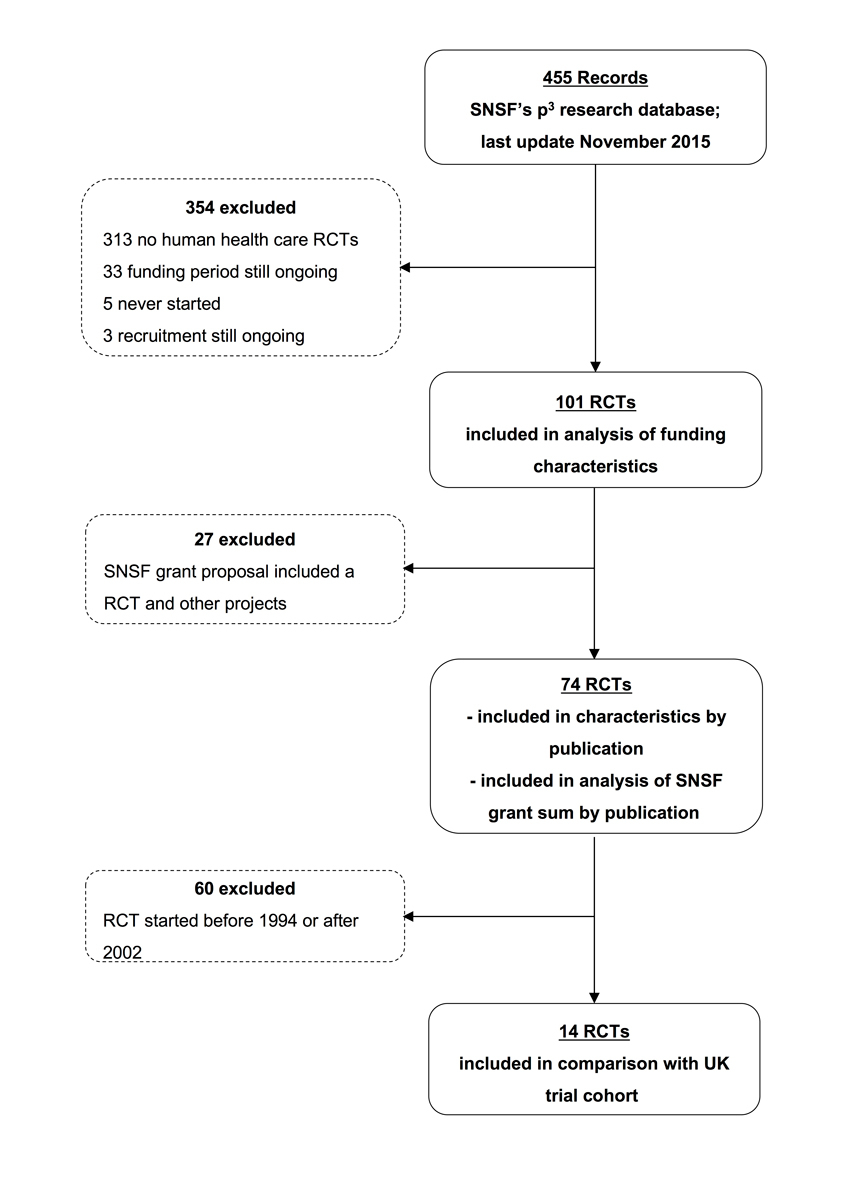 This is the first study assessing funding characteristics of publicly funded RCTs in Switzerland. After signing appropriate confidentiality statements, we had access to proposals for all healthcare RCTs supported by the SNSF without restriction by the funder or the applicants [14]. Methodologically trained reviewers systematically identified subsequent publications and extracted data independently and in duplicate. We combined information from several sources (grant proposals, trial registries, publications and investigator survey) in order to increase the accuracy of the data set.