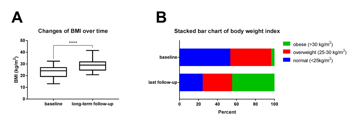 Figure 1 Stacked bar chart of patients’ BMI at baseline and long-term follow-up and changes in BMI over the study period. (A) There was a significant increase in patients’ BMI at long-term follow-up (from 23.1 ± 4.9 to 28.4 ± 4.9 kg/m2; p < 0.001). (B) At baseline, there was a significantly higher prevalence of patients with a normal BMI (53%) than at last follow-up (24%; p = 0.03). In contrast, at last follow-up, the prevalence of hypothalamic obesity significantly increased (45 vs 4%; p = 0.003).