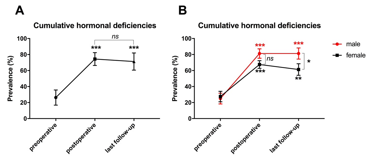 Figure 2 Cumulative pituitary deficiencies over the study period. (A) There was a significant increase in the cumulative pituitary axes deficits compared with baseline (p <0.001) or postoperative values (p <0.001). Long-term deficits in hormonal axes were not significantly different from postoperative deficiencies (p = 0.62). (B) Long-term endocrine deficiencies remained high and were more severe in male than female patients (p = 0.05)