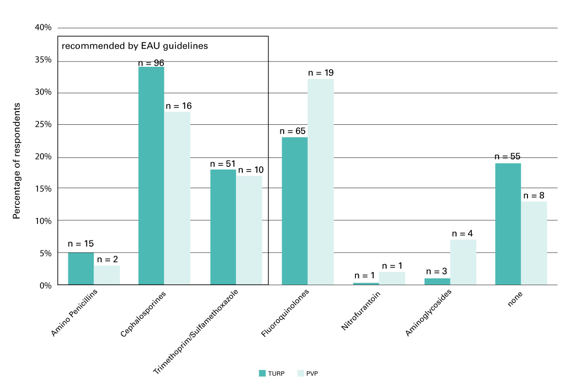 A total 5825 urologists received the online questionnaire; 6.4% (374/5825) completed the survey. The majority of urologists worked at university hospitals (30%, 111/374) with most of the participants having worked as a urologist for 10 to 19 years (28%, 106/374); 76% (286/374) performed TURP and 16% (60/374) PVP. For TURP and/or PVP, 64% (241/374) of urologists primarily used international guidelines as a basis for antimicrobial prophylaxis recommendations, followed by in-house guidelines (52%, 194/374), local resistance rates (36%, 133/374) and experience (29%, 108/374).