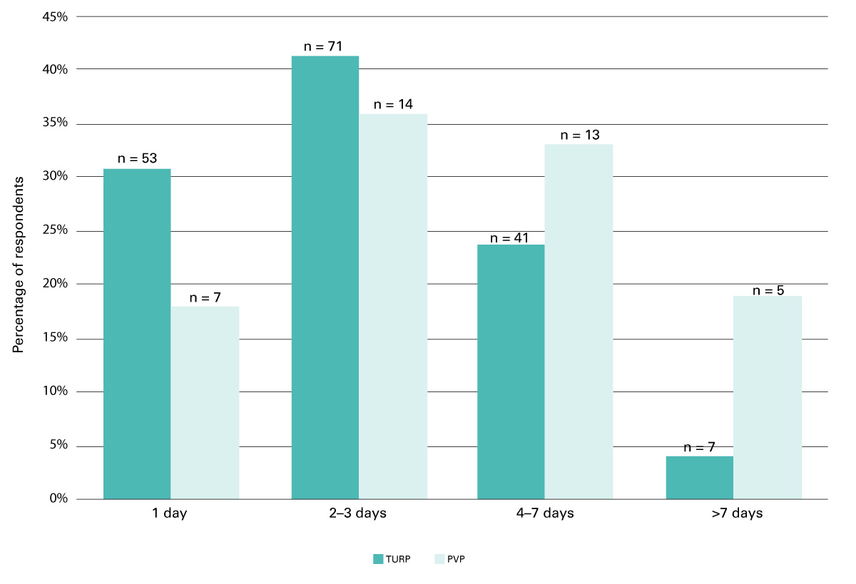 Figure 3 Prolonged postoperative antimicrobial prophylaxis. Overall, 60% (172/286) and 65% (39/60) of urologists extended antimicrobial prophylaxis after transurethral resection of the prostate (TURP) and photoselective vaporisation of the prostate (PVP). Prophylaxis was predominantly given for an additional 2–3 days (TURP 41%, 71/172; PVP 36%, 14/39).